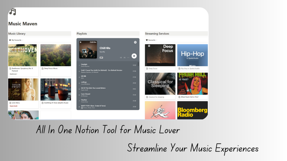 With its sleek design and user-friendly interface, our music lover Notion template is the perfect tool for music enthusiasts of all levels. Whether you're a casual listener or a die-hard music fan, this template will help you take your music experience to the next level.